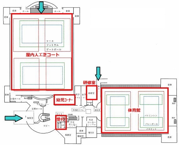 体育館 | バレー(2面)・バスケット(2面)・バトミントン(4面) 卓球(10面)可能 |